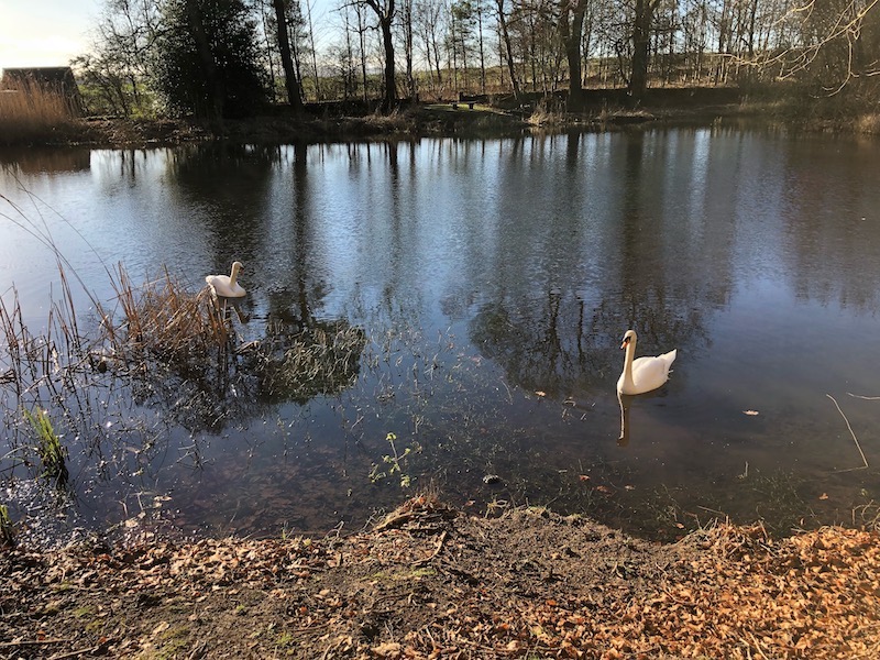 We’ve been keeping a keener eye and ear on the signals since the mysterious injury befell our female swan some time between storms Arwen and Barra. We have no idea how it happened. One day she was looking fine, as always a little more standoffish than her male partner but poised and elegant as she glided across the pond. That beautiful curved neck reflected in the water luring the camera out of your pocket for yet another snapshot. Next day she was a sorry sight: unsteady, off balance in the water, struggling to swallow food, a strange red mark just beneath her head and her elegant neck sadly twisted.