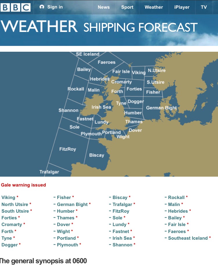 “Tyne, Dogger, Fisher…Sea state, very rough or high. Weather rain or showers, Visibility good occasionally poor