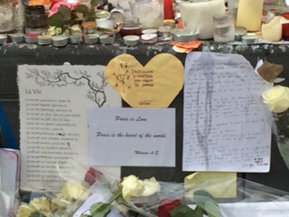 A few hours before our arrival, the official homage to the 130 killed took place at Les Invalides – with three young women singing Brel’s “Quand on n’a que l’amour…pour parler aux canons…” and another Barbara’s Perlimpinpin, with its opening phrases: “Pour qui, comment quand et pourquoi?/ Contre qui ? Comment ? Contre quoi ?/