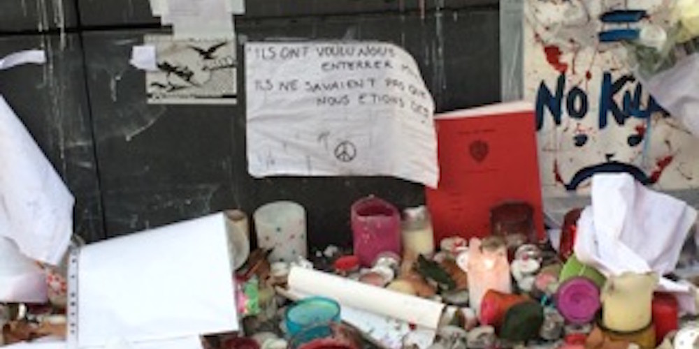 A few hundred metres away down the Boulevard Voltaire, by the Bataclan music venue, still promoting the Eagles of Death Metal, even more people gathered silently; some hung their heads as if in prayer outside and across the road by park railings festooned with even more placards: “I’m a Muslim but they didn’t speak for me, I’m for peace”; “Save the planet – and its people: Peace;” “We’re not even afraid” and scores more. The overwhelming majority of these texts were about shared humanity and common values. They defied fear.