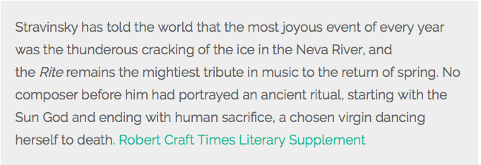 And all the time the music is playing. I have loved the Rite of Spring since I first heard it, more than 30 years ago. Visceral, violent stuff. Spring, like human birth, does not deliver easily. Stravinsky delighted in the cracking ice that signalled the bursting of new life into Russia’s frozen landscape.