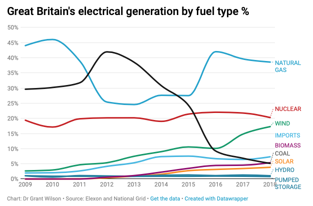 Nine years ago, Britain generated nearly 75 per cent of its electricity using natural gas and coal. In 2018, this dropped to under 45 per cent – a remarkable transition away from fossil fuels in under a decade.